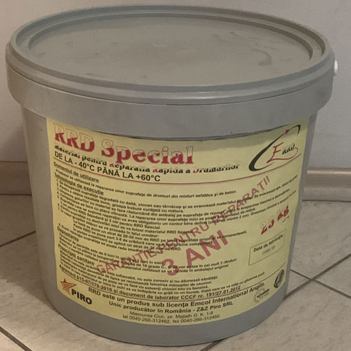 Mixtura Stocabila tip RRD Standard si mixtura stocabila rece RRD Special este un material care rezultă din amestecarea produsului Emcol Mixing Liquid cu agregate naturale. Lichidul de amestec-EML folosit la realizarea produsului este un produs englezesc (EMCOL) este utilizat în peste 65 de tări. Produsul se utilizează la repararea unor suprafete de drumuri din mixturi asfaltice si de beton.