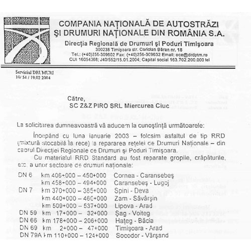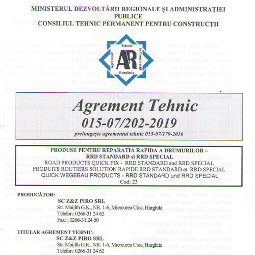 Asfaltul rece de tip RRD Standard si asfaltul rece RRD Special, fabricat de Z&Z PIRO Srl, sunt singurele produse pentru care s-au acordat agremente tehnice avand ca domeniu de utilizare reparatii curenteale suprafetelor in miscare aeroportuare.